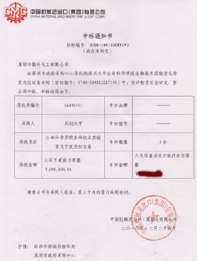 热烈祝贺铭科公司中标深圳大学实验室化学发光仪设备采购项目