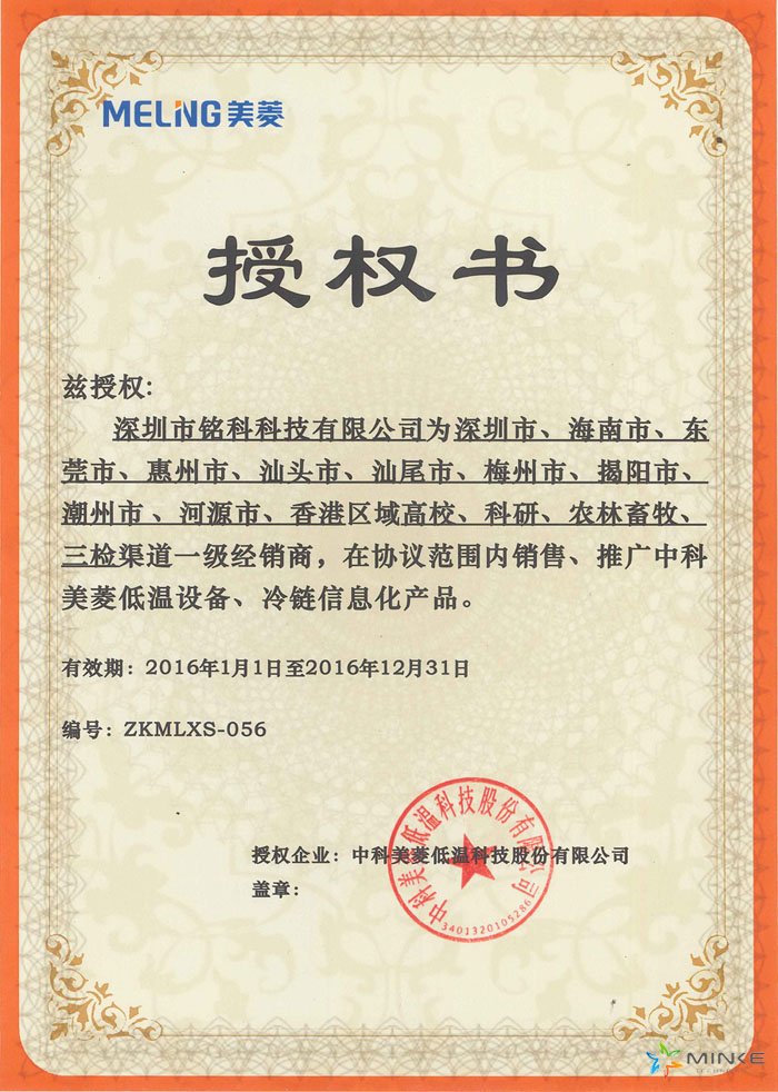 2016年3月14日,中科美菱低温科技股份有限公司授权深圳市铭科科技有限公司为一级经销商。
